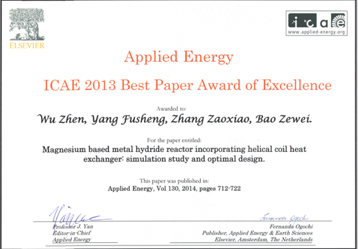 张早校教授领导的科研团队第一作者为博士生吴震的一篇论文被授予大会“Best Paper Award of Excellence”。获奖论文题目为“Magnesium based metal hydride reactor incorporating helical coil heat exchanger: simulation study and optimal design”。论文为氢能的存储提供了一种新型的反应器模型及其性能评价方法,该研究成果对实现镁基反应器的高效储氢具有重要的科学意义。该论文于2013年以口头报告的形式发表在南非召开的The 5th International Conference on Applied Energy(ICAE2013),并于2014年被ICAE2013会议学术委员会推荐发表在能源权威国际期刊Applied Energy(SCI源刊,IF=5.261)上[Applied Energy, Vol. 130, 712-722, 2014],且被该期刊主编评价为先进储能技术的一种创新。经过ICAE学术委员会的评选,于2015年获得ICAE2015会议的“Best Paper Award of Excellence”。ICAE每年颁发“Best Paper Award of Excellence”,“Best Paper Award”,“Best Paper for Young Scientists”等奖项,其中“Best Paper Award of Excellence”为该会议的最高奖项,由Applied Energy期刊和Elsevier出版社联合颁发,每年授予的名额只有2名。