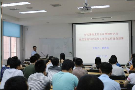 随后,依据学院年初制定的2015年度工作计划和上半年完成情况,魏进家副院长结合学校暑假工作会议精神,提出了下半年学院工作任务的详细部署。主要有:在各学科人才队伍建设方面,进一步加大力度推进青年拔尖人才的引进和培养工作,并继续引进新副教授、新讲师,着力向有海外经历的应聘者倾斜;在本科教学方面,依照学校对培养方案的总体改革方案,结合学院的特色和实际情况,修订各系培养方案以及教学大纲,此外还包括完成省教学成果申报、MOOC课程的申报、组建虚拟仿真实验室、出版教材和双语课程建设等;在科研方面,主要任务有申报十三五国家重点专项、陕西省科技统筹创新工程计划项目、能源化工工艺及装备技术联合研发中心项目、陕北能源化工企业项目等。在平台建设方面,做好陕西省重点实验室评审准备工作、科研团队组建、实验楼改造和实验用房分配工作。此外,魏进家副院长还就落实学校第十二次党代会的工作和“三严三实”专题教育工作,从严格按照各项规定对教职工进行考核、加强国际学术合作交流及联合研究平台的建设、加强研究生管理、加快校庆筹备工作步伐、提升行政办公效率等方面做了详细部署。最后,魏进家副院长表示,学院现处于发展的重要阶段,学院上下要对化工的发展充满信心,同时也要充分意识到,要做的事情还很多,要走的路还很长,希望大家明确目标,努力奋斗,乘势而上。