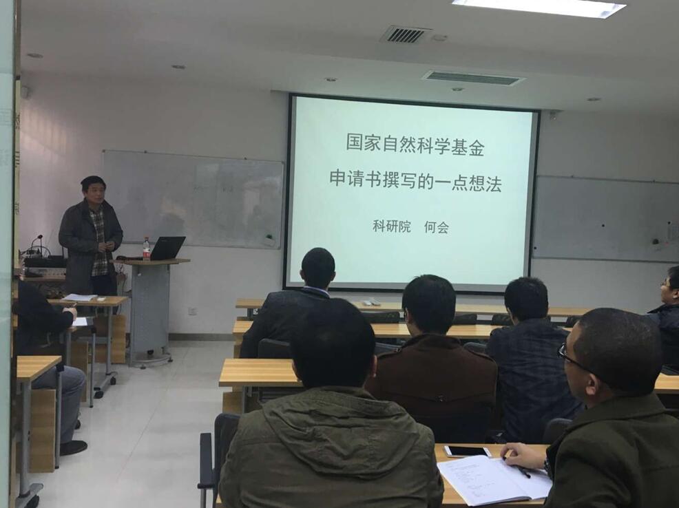 最后,学院邀请科研院基础与海外合作处何会老师为大家做2017年基金申请书撰写培训讲座。何会老师从申请书中的各个部分入手,生动的利用一些实际写作例子,依次讲解了各部分内容的写作技巧和关键点。他指出一个好的申请书要做到“外行看了有兴趣,内行看了有水平”,这需要申请人反复挖掘、抽象、凝练,从“我要做什么”出发,组织出一份条理清晰、内容丰富、打动人心的申请书。何会老师表示他将全力为即将申请基金的老师服务,预祝微密猫