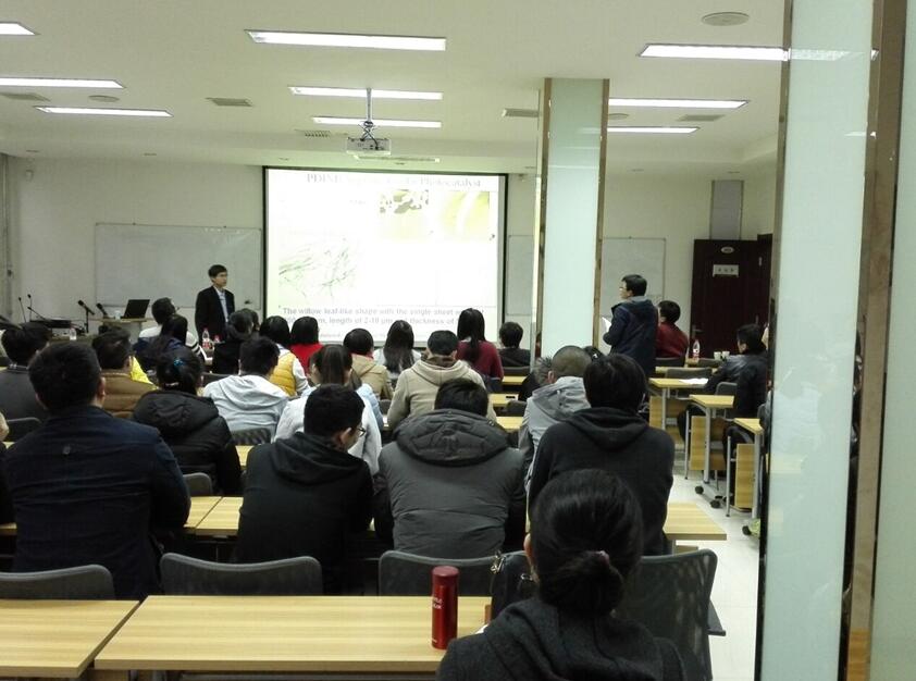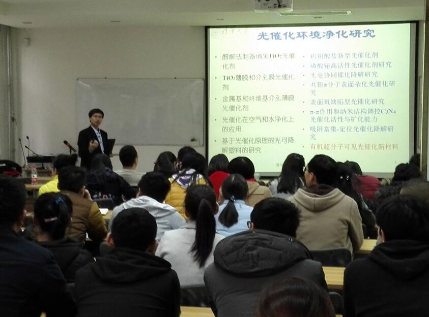 讲座伊始,朱永法教授介绍了光催化众多应用前景,包括家居材料、汽车业、公路行业、农业、水净化、空气净化以及医疗器械等。随后朱永法教授结合当下光催化高性能热点材料,绘声绘色地介绍了自己这些年来所做的众多优异工作。朱教授课题组通过引入缺陷位,离子掺杂,表面杂化,光电协同等方法,成功地制备包括BiPO4及g-C3N4在内一批具有高活性和循环稳定性的光催化材料。此外,朱永法教授还介绍了他们课题组在全有机超分子可见光催化降解有机污染物的最新研究进展。