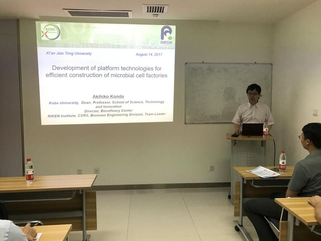 进行学术交流。访问期间,Akihiko Kondo教授做了题为“Development of platform technologies for efficient construction of microbial cell factories”的学术报告。Akihiko Kondo教授的报告主要讲述了平台技术的发展及其在微生物细胞工厂构建过程中的应用,并设计了具有特定功能的细胞直接用于生物燃料和化学品的生产。具体报告内容如下:细胞表面展示技术,包括:细胞粘附、生物转化、分子识别、信号传导等,Akihiko Kondo教授成功的在酵母乳酸菌、棒形菌设计了一系列细胞表面展示系统;合成生物工程平台的构建(GDCP),包括:合成途径、基因组设计、基因表达调控、基因簇设计、长链DNA合成。此外,Akihiko Kondo教授主导的生物炼制,细胞工厂,新药及药物载体设计等相关课题研究在生物化工和能源化工方面都具有重要的应用价值。Akihiko Kondo教授的讲座使学生开阔了视野、增长知识,还能积极促进 微密猫