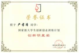 博士生严孝清获得“国创计划”十周年“创新明星奖”,成为全国6个创新明星奖之一。