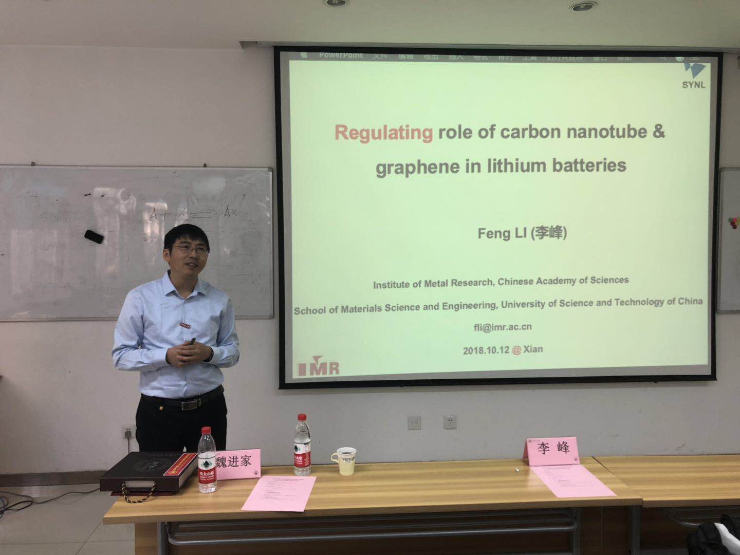 随后,李峰研究员作了题为“碳纳米材料及其锂电池应用”的主题报告。报告探讨了碳纳米材料在锂电池中的实际作用,在讨论了锂电池评估指标的基础上,从对电极结构、整体电池设计、电化学反应等角度考虑了碳纳米管和石墨烯在锂电池中的调节作用。最后,介绍了碳纳米管和石墨烯如何进一步促进锂电池发展的前景。报告受到在座学院师生的一致好评,报告结束后李峰研究员与在座师生进行了热烈的学术交流和讨论。