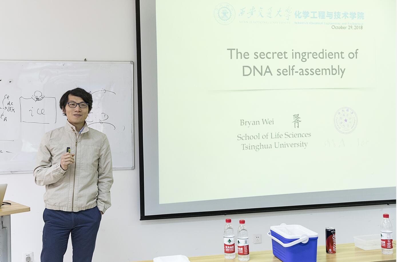 在弭教授的精彩讲座之后,他的博士毕业生,清华大学生命科学学院特聘研究员魏迪明博士做了以“The secret ingredient of DNA self-assembly( DNA自组装的秘方)”为题的工作汇报,向大家介绍了DNA自组装纳米技术的由来和他的代表性研究成果。在他的细心讲解下,在座的师生了解了DNA除了做为遗传物质载体,还可以利用碱基互补配对原则,通过巧妙地设计,进而自发地实现数以万计的DNA单链条有序自组装,形成非常复杂的拓扑结构。报告之后,魏研究员还与本院师生关于该项技术的潜在应用深入地交换了意见。