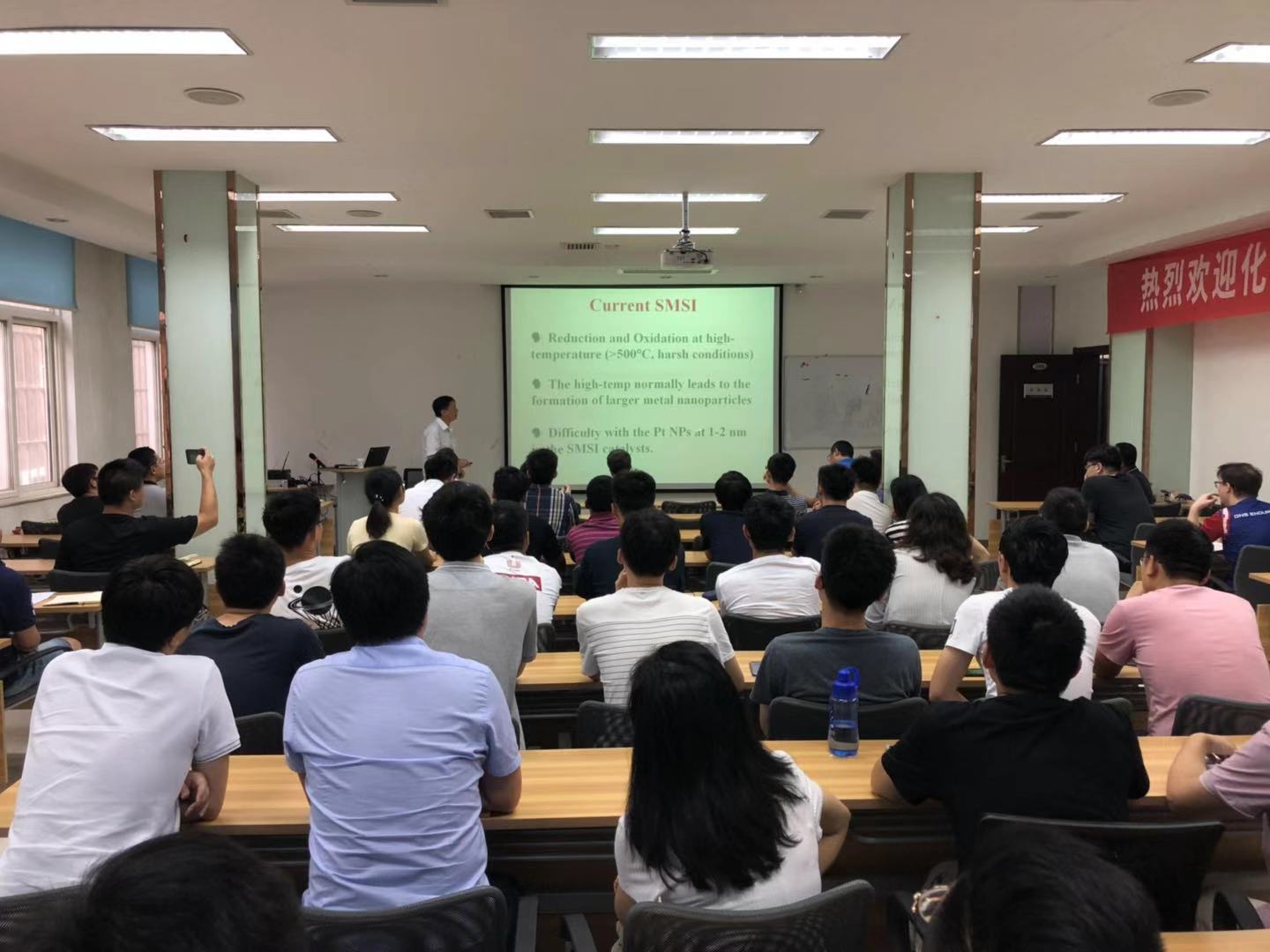 肖教授的报告首先从“催化剂稳定性的重要性”谈起,回顾了目前基于金属-载体强相互作用、碳层包覆等方式稳定金属纳米颗粒的策略,然后报告了自己课题组近年来发展的通过氧化物薄层包覆、构造载体凹陷、以及分子筛镶嵌等方式稳定金属纳米颗粒的普适性方法,并通过一系列生动的实例向大家介绍了被稳定的纳米颗粒在催化反应活性和选择性方面的独特性能及其在甲烷重整、合成气转化、空气净化、精细化学品合成、以及生态环境保护等领域的良好应用前景。肖教授的报告系统深入,从基础到应用均展现出催化的神奇与魅力,给与会师生带来了一场学术盛宴。会后,肖老师还与参加报告会的师生进行了热烈的讨论和交流,并一一解答了师生们提出的问题/疑惑。最后,大家以热烈的掌声对肖教授的精彩报告表示感谢。