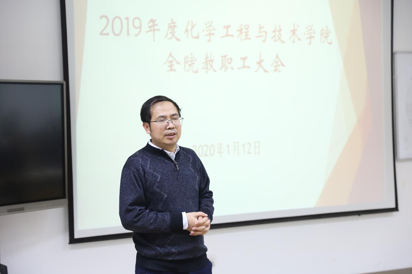 2019年度工作总结及2020年度工作计划》报告,全面总结了学院2019年在学科、队伍、教学、科研、国际化、创新港建设等十一个方面的成绩,梳理了学院发展过程中存在的问题,并围绕化工学科建设、化工研究院建设、体制机制综合改革等重点工作对学院2020年工作作出部署。他以化工研究院门楣标语“化物万千、工成一流”,勉励全院教职工凝心聚气、乘势而上,不断为学院创造历史印记新贡献。