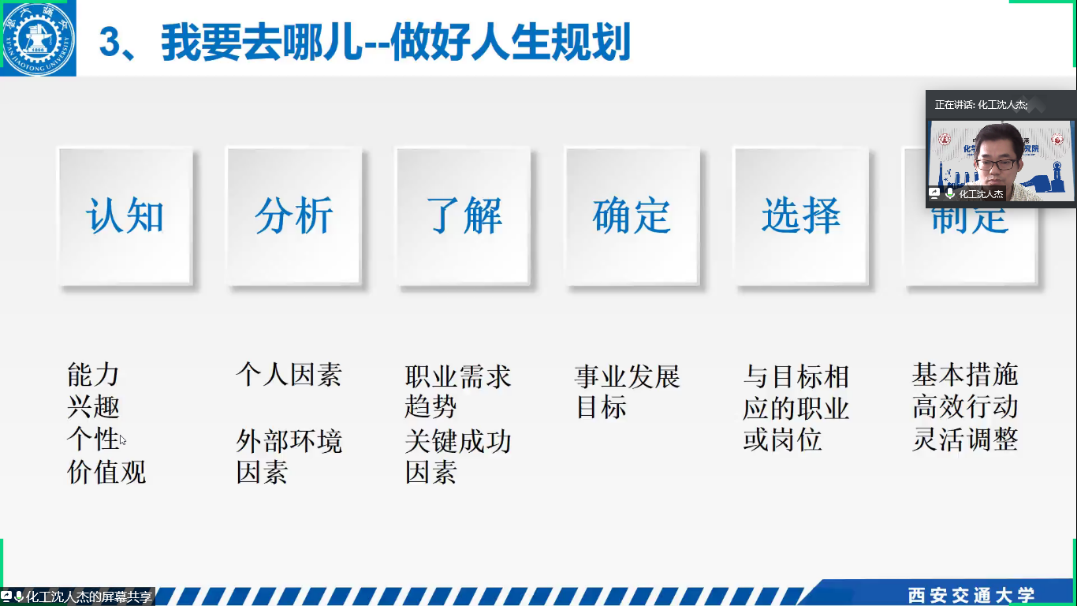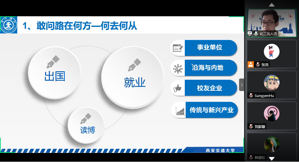 于2020年5月15日召开2021届研究生就业动员线上主题班会。班会由化机18级班长张亮主持,学院党委副书记沈人杰老师介绍学院往年就业情况,并分享关于如何做好职业规划的建议,化机18级与化工18级全体研究生同学参加。