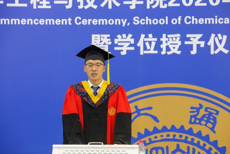 教师代表陈飞教授在发言中勉励全体毕业生要始终保持昂扬向上的奋斗精神,努力实现自己的目标和理想,做有志气、有干劲的化工人,并心存友善,不随波逐流,保持一颗平常心和仁爱之心,做社会良知的坚守者和传播者,为学院、为学校、为国家争光,为世界之光。