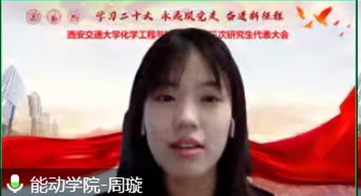 兄弟院系代表、能动学院研究生会主席团成员周璇对本次大会的召开表示热烈祝贺,期待两院研究生会继续保持亲切交流与密切合作,共同探讨新时期高校研究生会工作新规律新模式,为努力打造“富有理想、关心同学、清新阳光”的研究生会组织形象携手奋进。