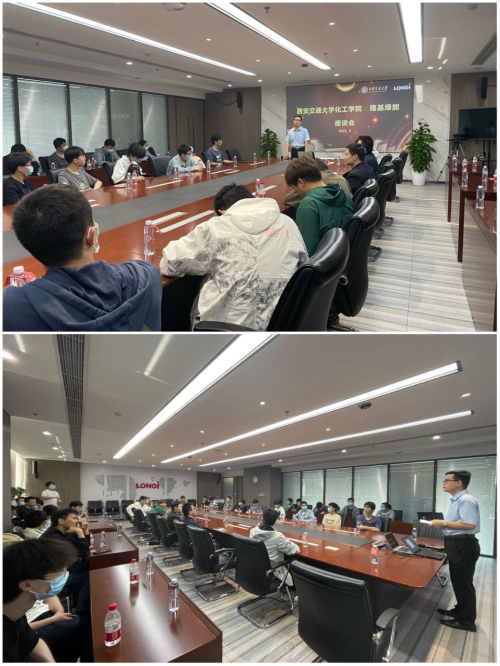 在随后的座谈交流环节,隆基绿能雇主品牌负责人周浩从中国双碳战略形成的背景、实现路径和难点出发,结合公司“绿电”+“绿氢”产品,为大家详细介绍了单晶硅片、电池组件、工商业分布式解决方案、解决方案、氢能装备等五大业务板块,通过“稳健可靠,科技引领”的品牌定位,与大家一起分享了公司成功的原因。同学们通过积极参与互动提问,进一步加深了对企业的认识,拓宽了专业知识面,增加了专业认知。最后,周总还为大家介绍了工作岗位、面试流程、相关待遇以及晋升通道等信息,大一同学们主要就暑期实习询问了相关细节。