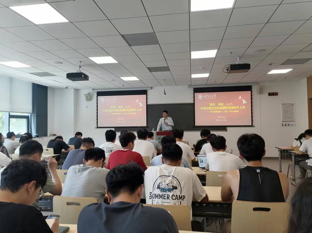 组织中心组扩大学习和党支部书记例会,学习二十届三中全会精神,邀请马克思主义学院刘占虎教授做“教育、科技、人才是中国式现代化的基础性、战略性支撑——学习贯彻党的二十届三中全会精神”主题讲座。院中心组成员、党支部书记、党团干部近80人与会。