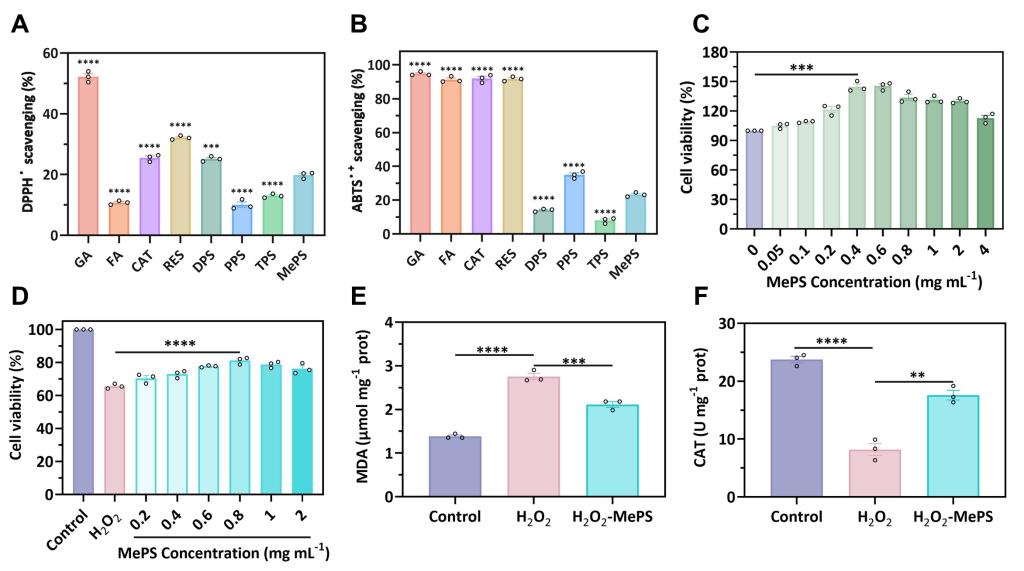 为深入研究甲烷基多糖的生物活性方面,研究团队开展了化学测试和细胞验证实验。结果显示,甲烷基多糖的自由基清除能力显著高于阿魏酸以及石斛、茯苓、银耳等天然植物源多糖。巨噬细胞培养实验进一步证明,添加甲烷多糖不仅能促进正常细胞的增殖,还可以通过降低脂质过氧化物含量和修复抗氧化酶活性,将氧化损伤胁迫下细胞的存活率提高近20%(图2)。这一结果有力地证明了甲烷基多糖具高抗氧化活性,为其在生物医用材料领域应用奠定基础。相关研究成果已发表于国际知名期刊《Journal of Agricultural and Food Chemistry》, 微密猫