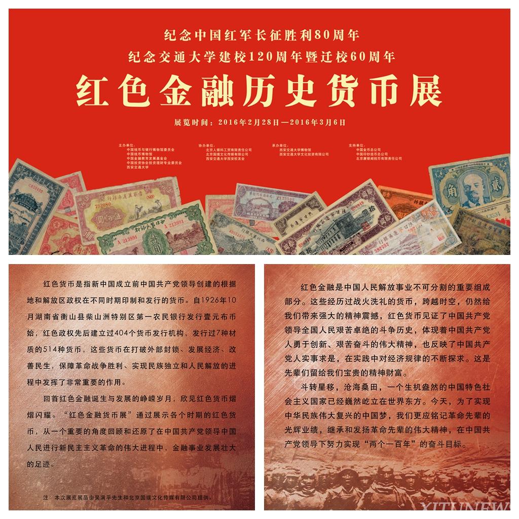 为纪念中国红军长征胜利80周年、交通大学建校120周年暨迁校60周年,2月28日起,西安交大博物馆将举办“红色金融历史货币展”,以展板、实物和视频等多种形式展示各个时期的历史货币,以独特视角回顾中国共产党领导中国人民进行新民主主义革命的伟大进程,展现我党金融先辈们创业的足迹、卓越的智慧和无私的奉献精神。