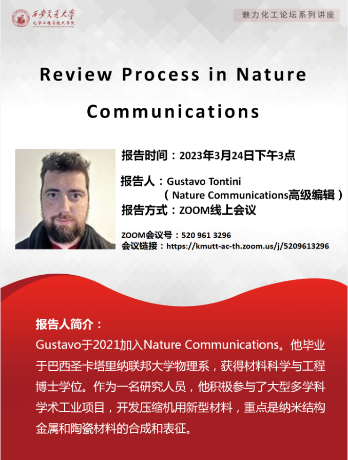 学院邀请Gustavo Tontini博士于3月24日(周五)下午3:00做题为《Review Process in Nature Communications》的讲座。Gustavo Tontini博士是《Nature Communications》高级编辑,讲座内容对师生高水平论文写作能力将有较大促进作用,请积极参加!