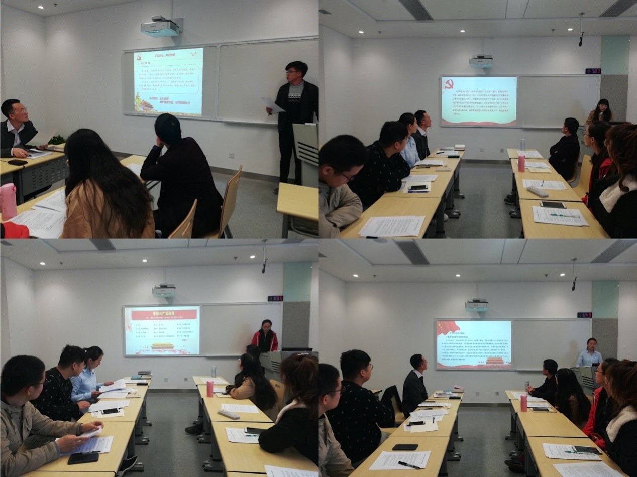 支部正式党员、预备党员、积极分子及入党申请人代表闫浩祺、曹亚飞、王智聪、石珈珞分别以“学习习近平总书记在新中国成立70周年大会讲话,弘扬爱国主义精神”、“深入贯彻立德树人重要论述,学习贯彻习近平总书记在全国教育大会重要讲话”、“学党章、知党章,深化党员政治觉悟与组织观念”、“弘扬西迁精神,致敬最美奋斗者”为题开展“不忘初心、牢记使命”主题教育专题集中学习会,进一步学习“爱国主义精神”、“习近平总书记教育领域重要讲话”、“中国共产党党章”、“西迁精神”等。石珈珞同学提出,要将西迁精神发扬光大,更要将西迁精神落地生根,在创新港践行西迁精神。