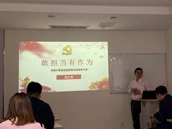 随后沈人杰老师给大家讲解了主题为敢担当有作为的党课,阐明了敢担当有作为是一种有责任勇于担当鲜明的政治品格,其现实内涵在于甘于担责,乐于担事,勇于担错,善于担难,敢于担险,这种宝贵的品格由党员的先进性以及优秀传统决定。因此党员要做到敢担当有作为,需要信念过硬,政治过硬,能力过硬,作风过硬。