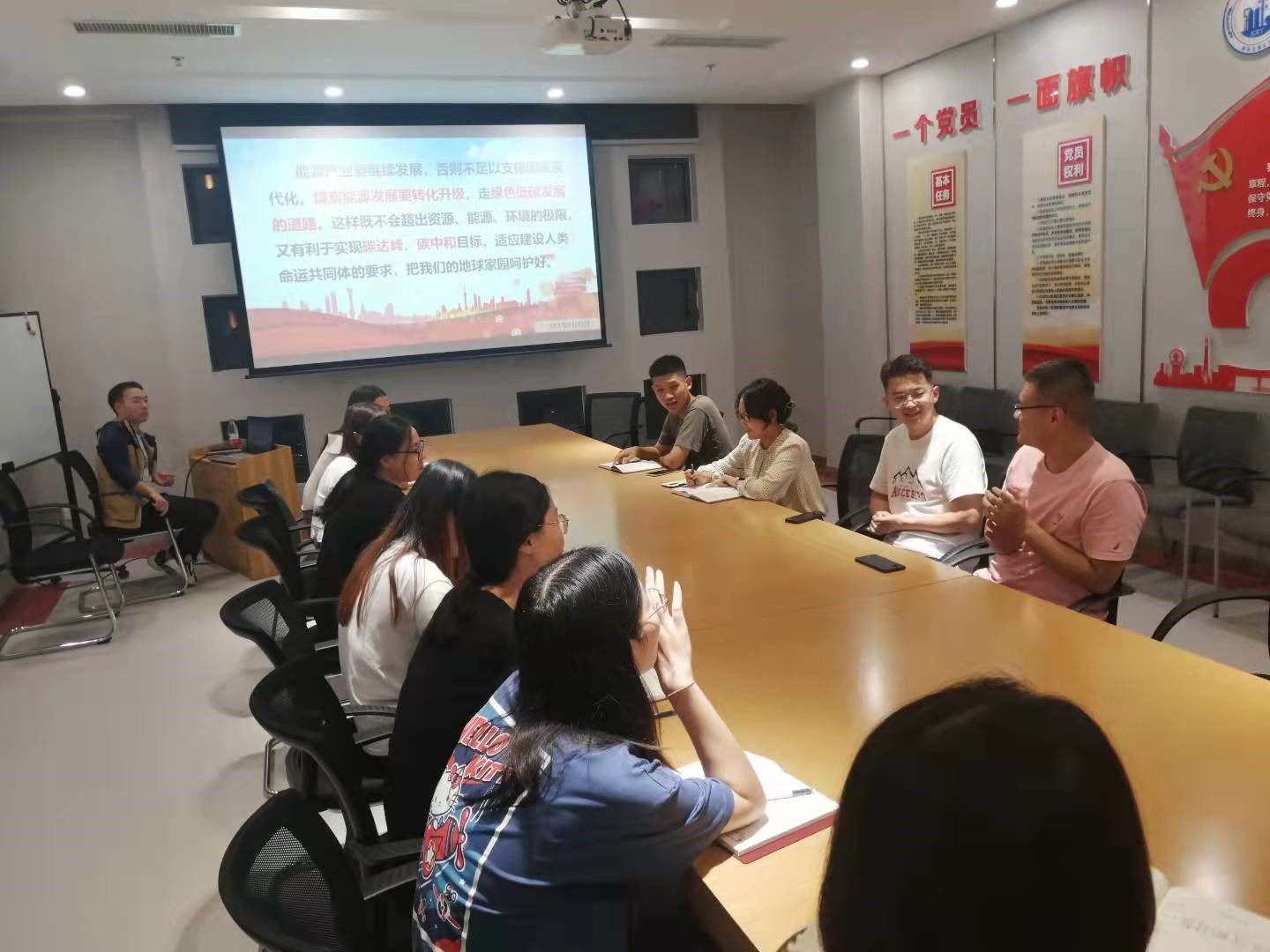 郭遥同志还带领大家回顾了总书记在考察过程中针对现在能源发展和国家建设提出的指导和方向,特别是关于坚持和完善党的领导、能源低碳发展、产业转型升级、生态文明建设、传统文化保护与传承、乡村振兴等方面的重要指示要求,充分彰显了党的领袖对“两个大局”的深刻洞察,体现了把握重要战略机遇期的一贯要求,是对立足新发展阶段、贯彻新发展理念、构建新发展格局的科学指导,为我们实施碳达峰、碳中和的目标提供了路径指引,为全方位推进高质量发展提供了重要遵循。