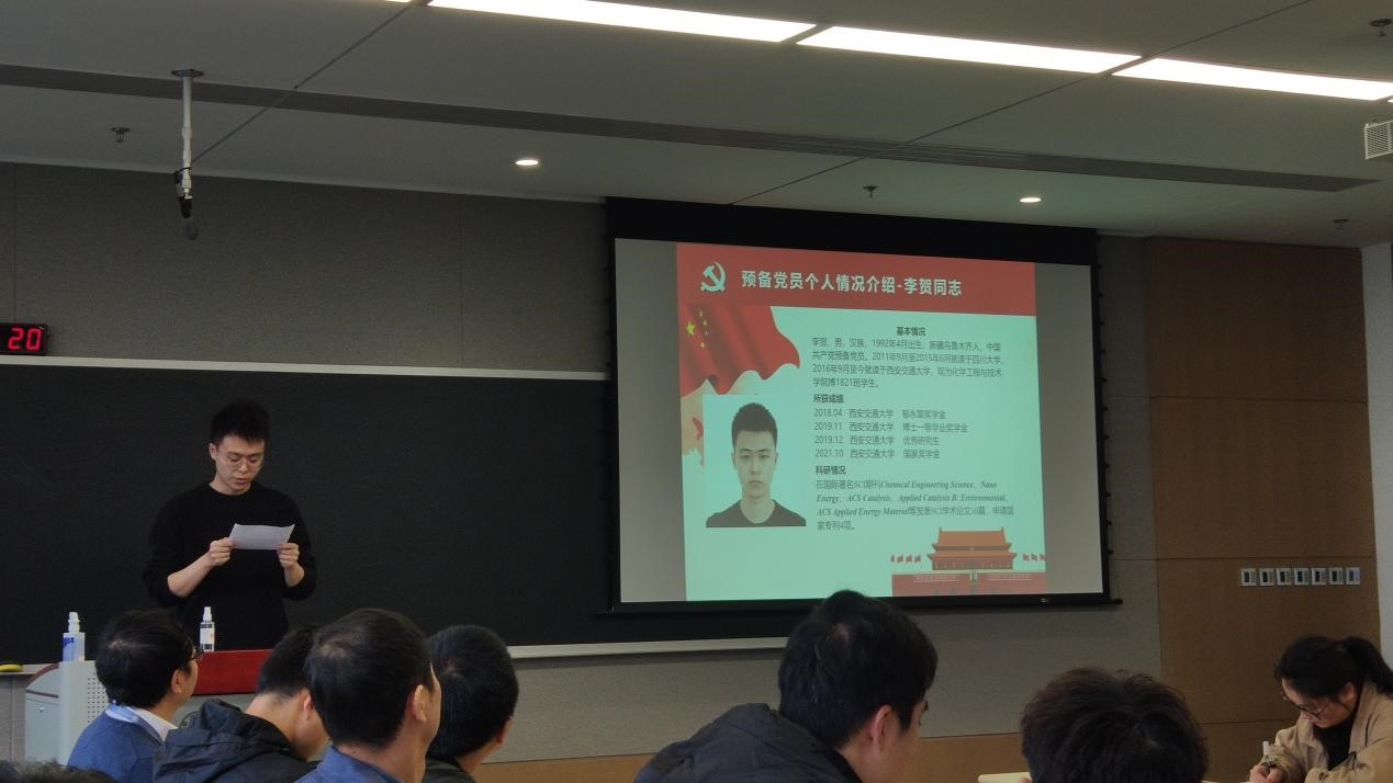 会议第二项内容为预备党员转正,由张博同志主持。李贺、马广举两位预备党员汇报了自己在预备期间的表现,表明自己的态度和决心。两位党小组组长介绍了两位预备党员在预备期间的表现情况,并提出了两位预备党员能按时转正的小组意见。吴志强同志代表支委会介绍了对预备党员的审查情况,并提出了预备党员能转为正式党员的意见。会议通过选举办法并选举严孝清同志担任监票人、张博同志为计票人,支部党员对两位预备党员能否转为正式党员进行了讨论、表决,全体一致通过两位预备党员转为正式党员。