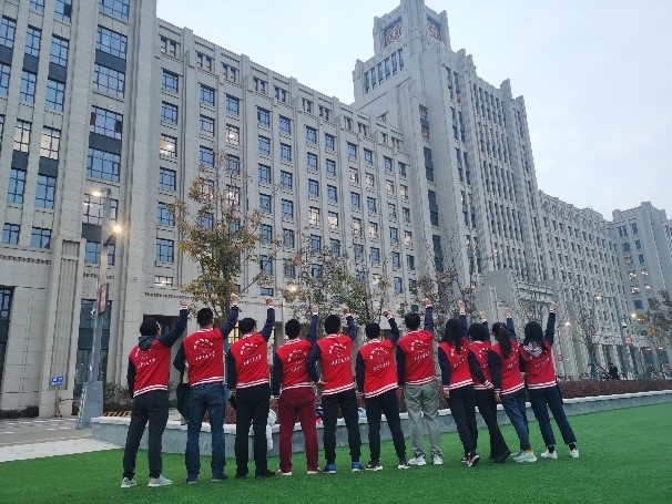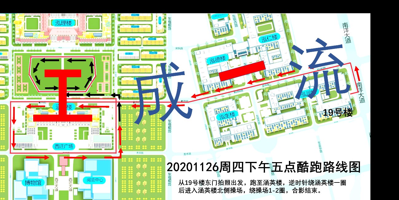跑步大军由泓润楼东门出发,一路向西跑至涵英楼,继而绕涵英楼一周后进入操场,个人根据自身情况绕操场跑若干圈。该跑步路线一方面让我们领略了新港的优美环境及壮阔楼宇,另一方面形成了“工”字及“一”字,寓意我们微密猫