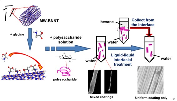 µm) uniformly coated with either cationic or anionic or zwitterionic polysaccharides, such as chitosan, hyaluronic acid and phoshorylcholine-substituted chitosan. As illustrated in Figure 1, the method requires three major steps: (1) glycine adsorption (2) addition of the polysaccharide and finally (3) isolation of the uniformly coated nanotubes from the coarsely coated ones via an oil/water interfacial treatment step. The complete coverage of the polymer on the BNNT has relevant implications in the fabrication of nanohybrid materials for biological functions, such as minimizing any possible influential effects that can be introduced from a barely exposed surface of a coarsely-coated BNNT in a physiological environment. Our result had turned theoretical calculations into practice whereby the amine terminal of glycine binds to the B-sites of BNNTs, while the carboxylic acid terminal provides ionic anchoring sites for interactions with polyelectrolytes. Moreover, this was also the first report on the potential capability of the biofunctional BNNT as a Pickering emulsifier where such a unique property was successfully harnessed for length fractionation.