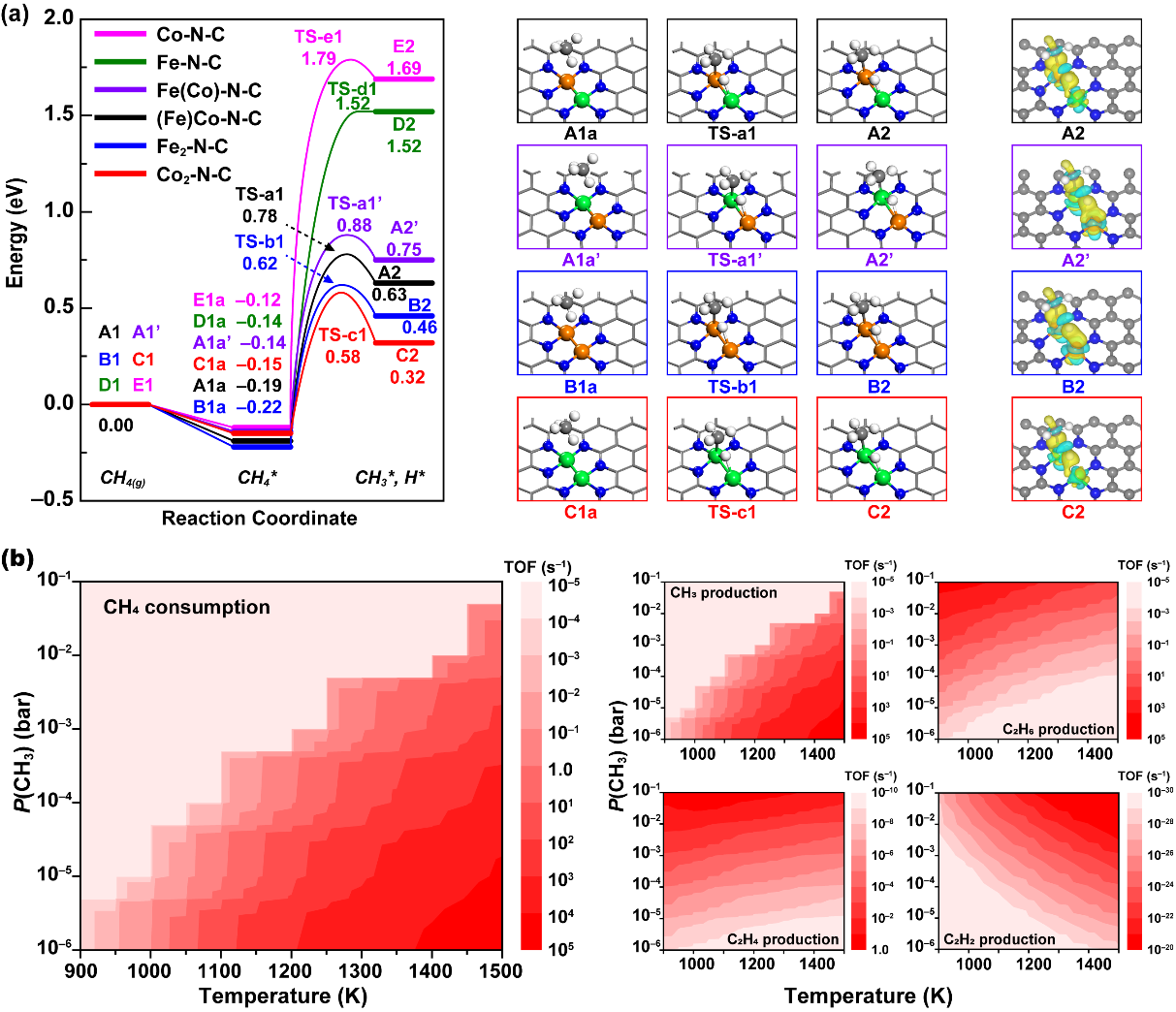 的常春然教授课题组,以提高C–H键活化能力、强化表面C–C键偶联为突破口,采用第一性原理计算、分子动力学模拟、微观动力学模拟等工具,在氮掺杂石墨烯上理论设计出甲烷分解活性高、C2烃选择性高、高温稳定性、抗积碳性能优异的双金属位点催化剂。研究选择非贵金属Fe、Co作为活性中心金属元素,形成两种同核(Fe2–N–C与Co2–N–C)、一种异核(FeCo–N–C)的活性位点。如图2a计算结果所示,三种双金属位点催化剂的C–H键活化能力显著优于单原子催化剂(Fe–N–C与Co–N–C),并且同核位点的活性优于异核位点。经过电子结构分析发现,同核位点金属原子,特别是Co2–N–C,在费米能级位置3dz2的态密度要明显大于异核FeCo–N–C位点的,而高态密度决定了原子的高反应活性。随后,研究计算了两个甲烷分子在三种双金属位点上的无氧偶联反应。计算结果表明,在双金属位点上乙烷会优先生成,并且Co2–N–C的反应活性最高。为了研究反应条件下反应的活性与选择性,研究在Co2–N–C上进行了微观动力学模拟(图2b)。在1200 K温度下,C2产物中乙烷的选择性最高,并且乙烷生成的TOF可以达到10–2s–1,基本满足工业要求水平。此外,从头算分子动力学模拟与反应自由能计算还表明,Co2–N–C催化剂具有良好的高温稳定性与抗积碳能力。因此,本研究预测此类双金属位点催化剂将在甲烷无氧转化过程中具有良好的应用前景。