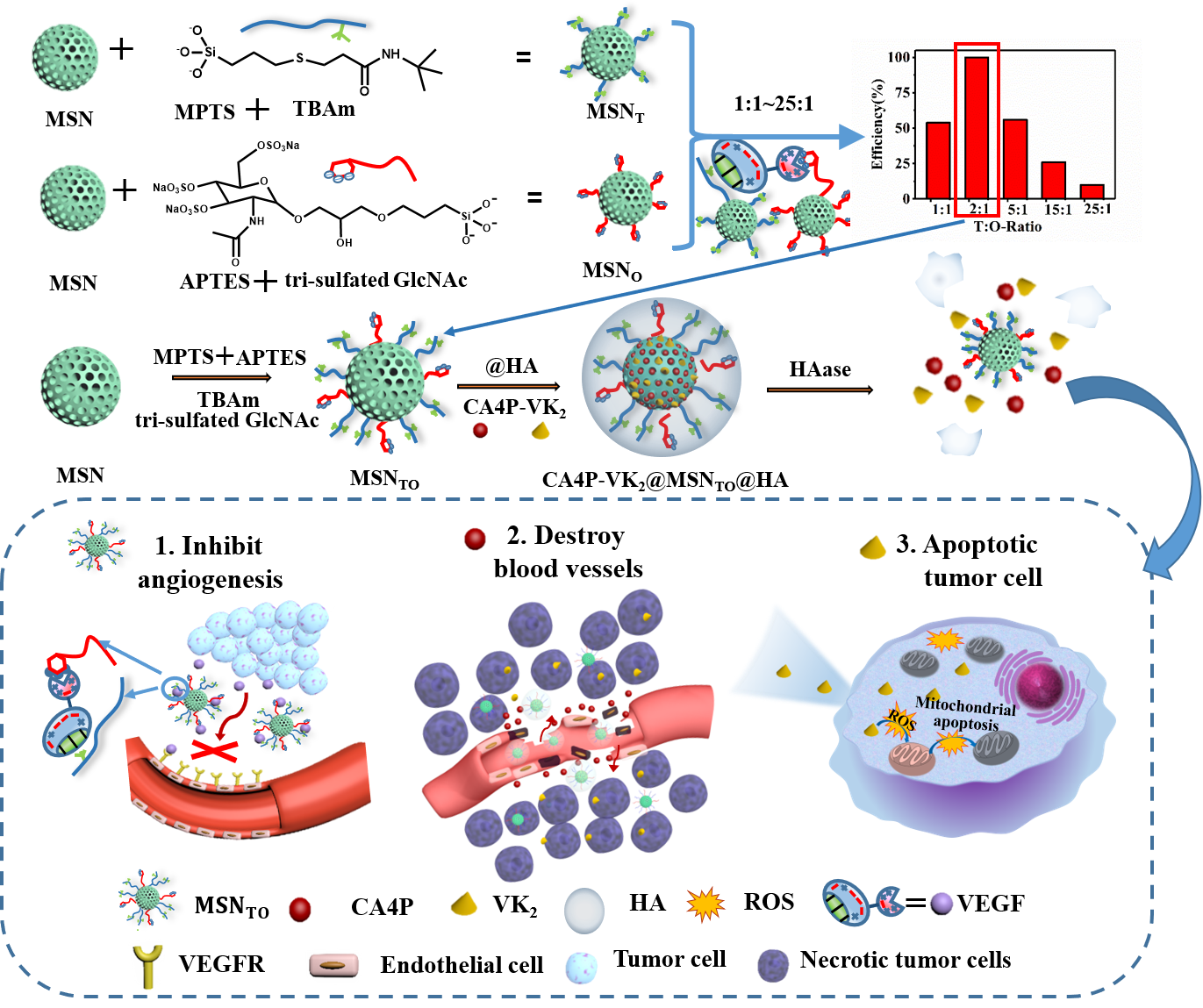 药学院张彦民教授团队通过简单的水解-缩合反应制备了疏水单元(N-叔丁基丙烯酰胺,TBAM)和葡萄糖衍生物(三硫酸化N-乙酰氨基葡萄糖,TSAG)共改性的介孔二氧化硅纳米粒子(MSNMG),作为血管内皮生长因子(VEGF)的仿生亲和剂。其将作用于VEGF的疏水结构域和带正电荷结构域以实现抗血管生成。基于介孔二氧化硅纳米粒子易于表面的功能化的特点,研究团队精准调节了TBAM与TSAG的比例,在两者比例达到2:1时实现了最佳的治疗效果。同时,研究团队利用MSNMG的多孔结构负载康普瑞汀A4-磷酸盐(CA4P,血管破坏剂)及维生素K2 (VK2,ROS生成剂),并进一步在其表面构建透明质酸冠层,制备仿生纳米材料(CVMMGH)。这种材料在使用后能通过CD44受体介导的结合进行肿瘤靶向,并在透明质酸酶的作用下暴露TBAM/TSAG基团并释放出CA4P和VK2,逐步实现CA4P诱导的肿瘤血管破坏、VEGF捕获引起的血管生成抑制、及ROS 产生导致的线粒体功能紊乱,同时从肿瘤组织营养物质的传输和利用两个方面着手完全阻断肿瘤能量供应,实现精确高效的肿瘤治疗及转移抑制。