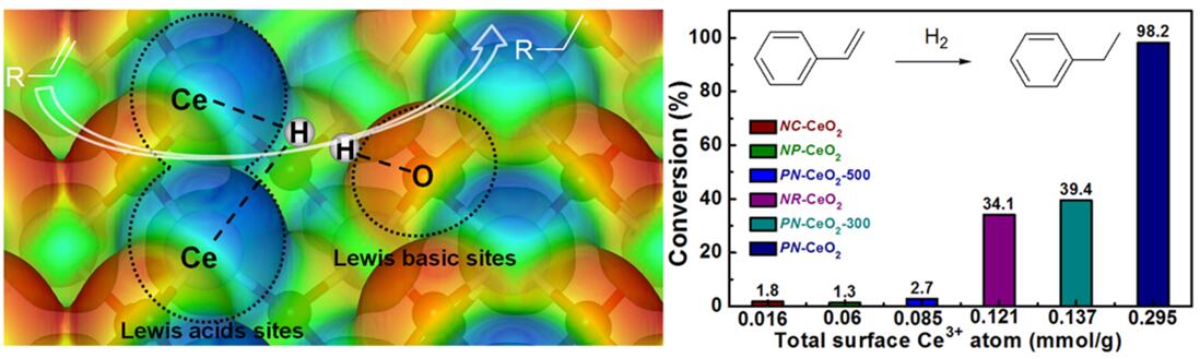 常春然副教授课题组与前沿院瞿永泉教授课题组合作,通过表面修饰工程在二氧化铈表面调控氧空穴,设计并制备出含FLPs活性位的全固相催化剂。这种特殊的活性位点由两个相邻的铈原子(Lewis酸)和氧空位相邻的一个氧原子(Lewis碱)组成。经理论和实验证实该类固体FLP催化剂对氢气分子的解离活化以及不饱和烃的加氢具有近贵金属催化剂的活性。以上通过调控氧空穴构筑固体FLP催化剂的理论基础明确,制备工艺简单,对开发其它固体氧化物基的多相FLP催化剂具有普适性指导意义。以上研究结果于5月18号发表在在国际知名期刊Nature Communications上(2016年影响因子11.33), 微密猫