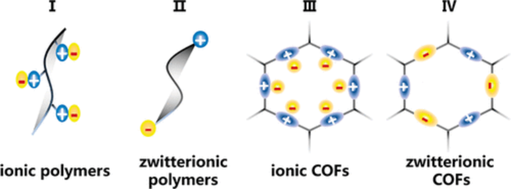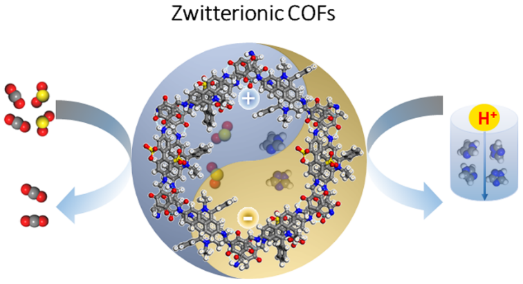 近年来,共价有机骨架(COF)作为一类结晶多孔材料在多个领域引起了广泛关注。其可调控性的精确骨架结构及可预先设计的开放通道,使COF材料成为探索官能团与性能之间关系的理想平台。在COF骨架中引入阴离子或阳离子位点能显著改善其离子传输性能,已在固态锂离子电池领域展现出应用潜能。然而,同时将阴、阳离子官能团引入到COF骨架中以形成两性离子COF材料的研究尚未有人探索。两性离子COF骨架内同时具备阴、阳离子位点的孔道结构能够实现在纳米空间内电荷密度的精准调节,这给设计具备特定功能(气体分离和离子传导)的材料提供了新的思路。