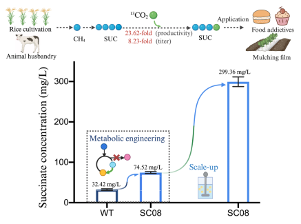 甲烷(CH4)和二氧化碳(CO2)是导致全球气候变暖的主要温室气体,它们的排放量与温室效应紧密相关。为了应对能源使用活动产生的温室气体排放导致的全球气候变暖问题,全球学术界和产业界越来越重视CH4和CO2的捕获与利用。通过先进的生物制造技术和合成生物学技术,可以利用微生物有效地固定这些温室气体,这不仅能够显著减少温室气体的排放,而且可以将沼气、煤矿瓦斯、废弃天然气(如页岩气)转化为高价值的化学品,这对于实现中国的碳中和目标和能源的高效综合利用具有重大意义。琥珀酸作为一种重要的二元羧酸,在医药、可降解塑料和食品添加剂的生产中有着广泛的应用。因此,利用CO2和CH4作为原料生产琥珀酸,可以减少对化石资源的依赖,拓展生物制造的原料来源,并推动国家的绿色可持续发展。