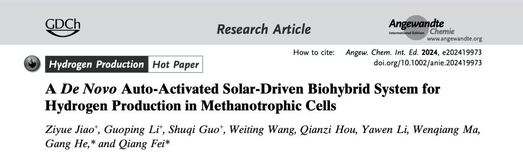 该研究成果以《嗜甲烷菌中的自激活光驱动生物杂化制氢体系》(A De Novo Auto-Activated Solar-Driven Biohybrid System for Hydrogen Production in Methanotrophic Cells)为题,在国际著名学术期刊《德国应用化学》(Angewandte Chemie International Edition)上以Hot Paper发表。 微密猫 为唯一通讯单位,微密猫 博士生焦子悦、副教授郭树奇和前沿院副教授李国平为共同第一作者,前沿院何刚教授和微密猫 费强教授为共同通讯作者。该研究得到了国家重点研发计划、国家自然科学基金、高等学校学科创新引智计划、陕西省杰青基金、陕西省科学基金等项目的支持。