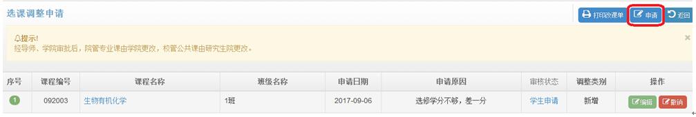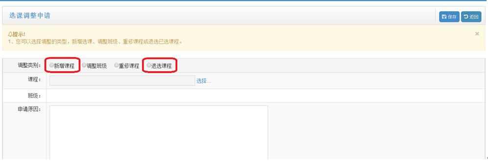 3.进入调课申请页面,分别选择新增课程与退选课程进行调整(选择课程、班级,并填写申请原因):