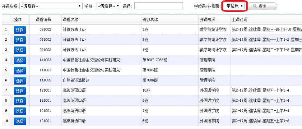 4.待调整课程如图,学位课和选修课更换在图示框中选择,保存完成后返回可见如步骤2中例1:
