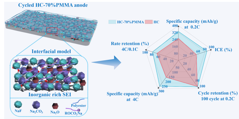此外,钠离子电池负极侧固有的低首效这一问题也掣肘在大规模储能以及消费电子等领域的应用前景。研究团队基于通过调节粘合剂官能团诱导SEI形成的策略,率先提出使用更具成本效益的聚甲基丙烯酸甲酯(PMMA)部分替代聚偏氟乙烯(PVDF)的复合粘结剂一工艺路线,将C=O(羰基)键均匀地植入硬碳表面,以满足粘合要求并实现界面功能化重建。C=O键的引入优化了硬碳的内在微观局部电荷分布,增强了可逆Na+吸附。合理的结构调节有利于电解质盐的优先分解,促进富含无机成分的稳定SEI的形成,改善了界面处Na+的传输动力学。