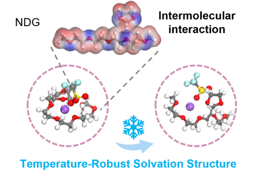 艰难的去溶剂化过程是可充电电池中有机电解质面临的主要挑战,尤其是在低温条件下。尽管传统方法是使用在溶剂化结构中有高度阴离子参与的电解质,即弱溶剂化电解质(WSEs),但这些电解质的溶剂化结构极易受到温度波动的影响,这可能会削弱其低温性能。为了解决这一局限性,该研究团队设计了一种创新的电解质,利用溶剂分子之间的相互作用,有效地融合了强溶剂和弱溶剂,使其溶剂化结构具有阴离子参与且能够抵御温度波动的影响。该研究从溶剂-溶剂相互作用出发,为宽温域电解液的设计提供了一种新的视角。